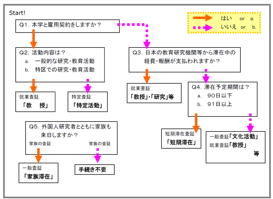 査証は、それぞれの入国目的に応じ、外交、公用、就業、一般、短期滞在、通過、特定査証の7区分のうち、いずれかの査証が発給されますが、本学が受け入れる外国人研究者が取得する査証はそのうち数種類に限られます。その査証区分および対応する在留資格は次のとおりです。