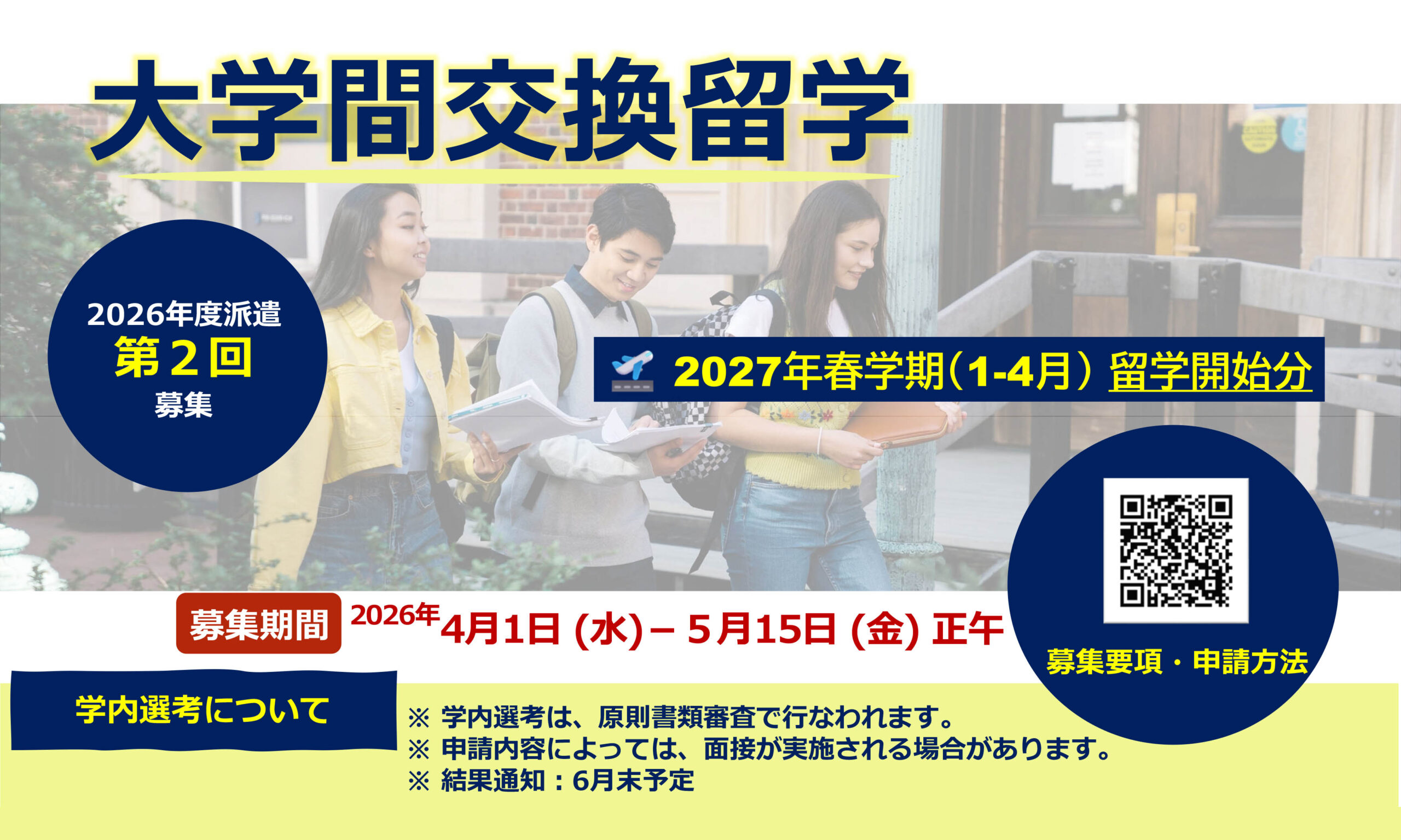- 募集中 【4/1(水)開始】大学間交換留学プログラム2026年度派遣 第2回学内募集について