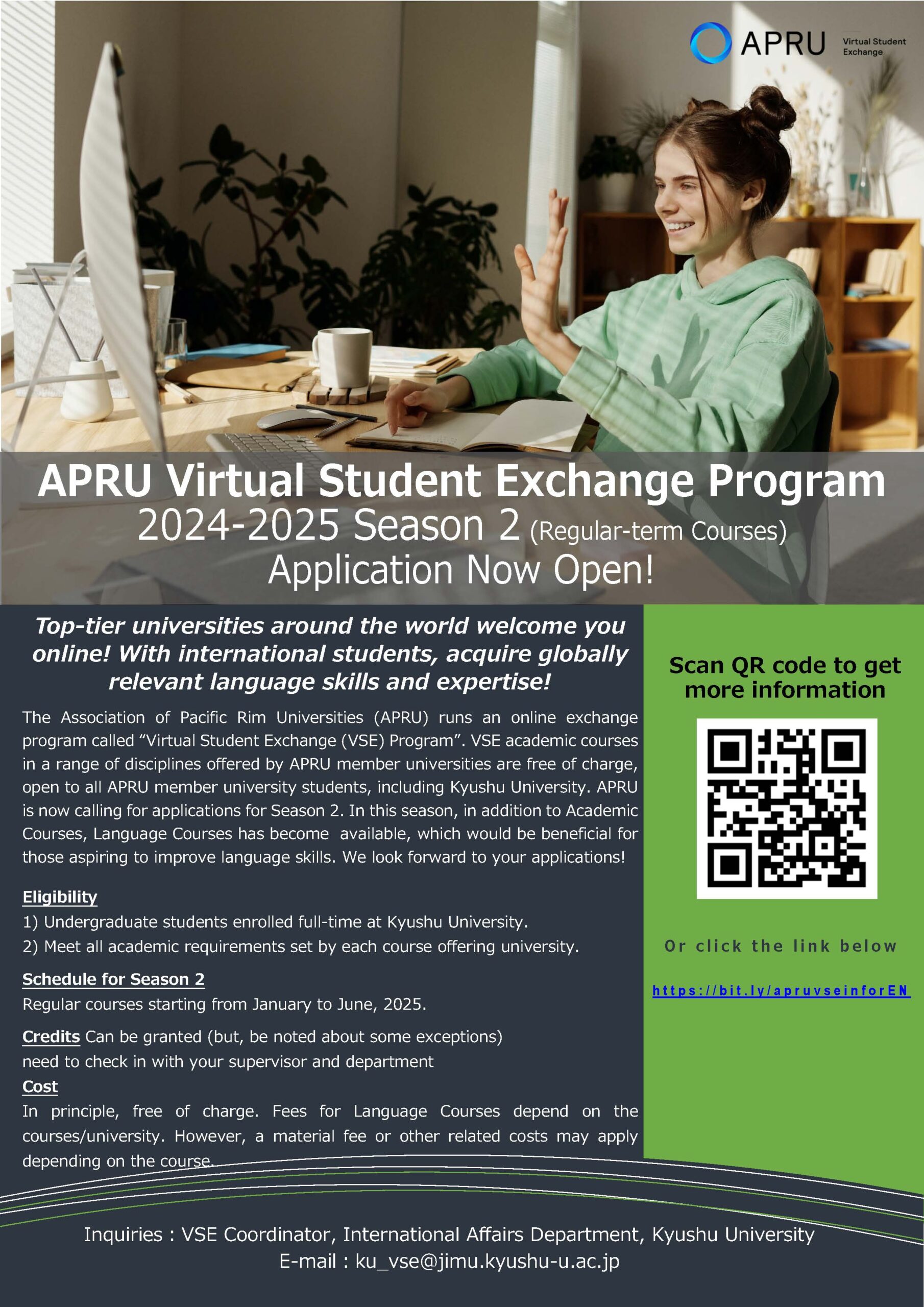 The Association of Pacific Rim Universities (APRU), of which Kyushu University is a member, runs an online exchange program called “Virtual Student Exchange Program (VSE)”. This program allows students to take international courses without having to travel. VSE academic courses in a range of disciplines offered by APRU member universities (as course offering universities) are free of charge to all APRU member university students, including Kyushu University. Undergraduate students at Kyushu University can take one (or two) academic courses during each season. After successfully completing a course, students may be able to earn credits from the course offering university (some exceptions may apply). APRU is now accepting applications for 2024-2025 Season 2, regular-term courses offered between January and June 2025. For more information, please refer to the following information. We look forward to your applications!