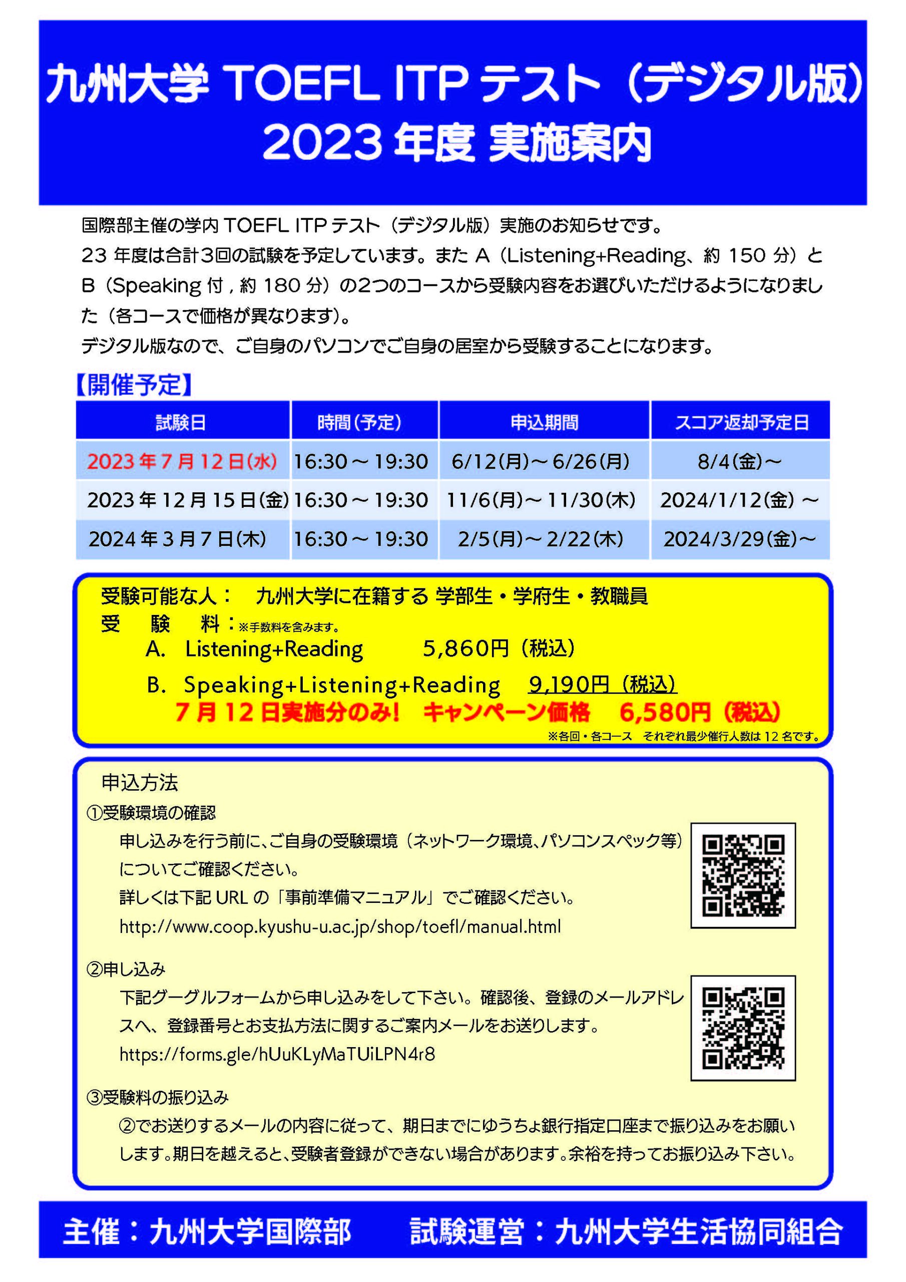 - 7/12(水)九州大学TOEFL ITPテスト第1回(デジタル版) 受験者募集