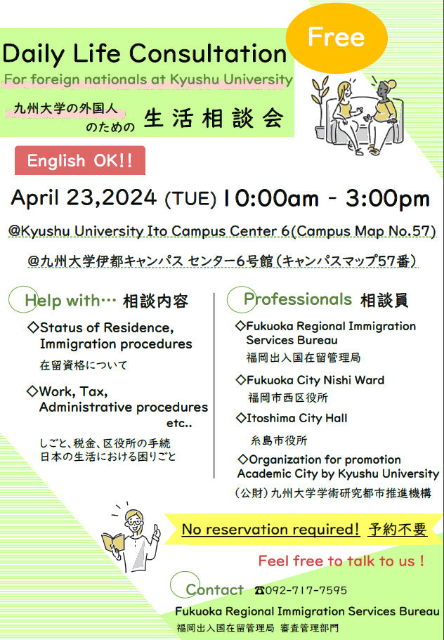 福岡出入国在留管理局が、伊都キャンパスで「生活相談会」を開催することになりましたので、お知らせします。