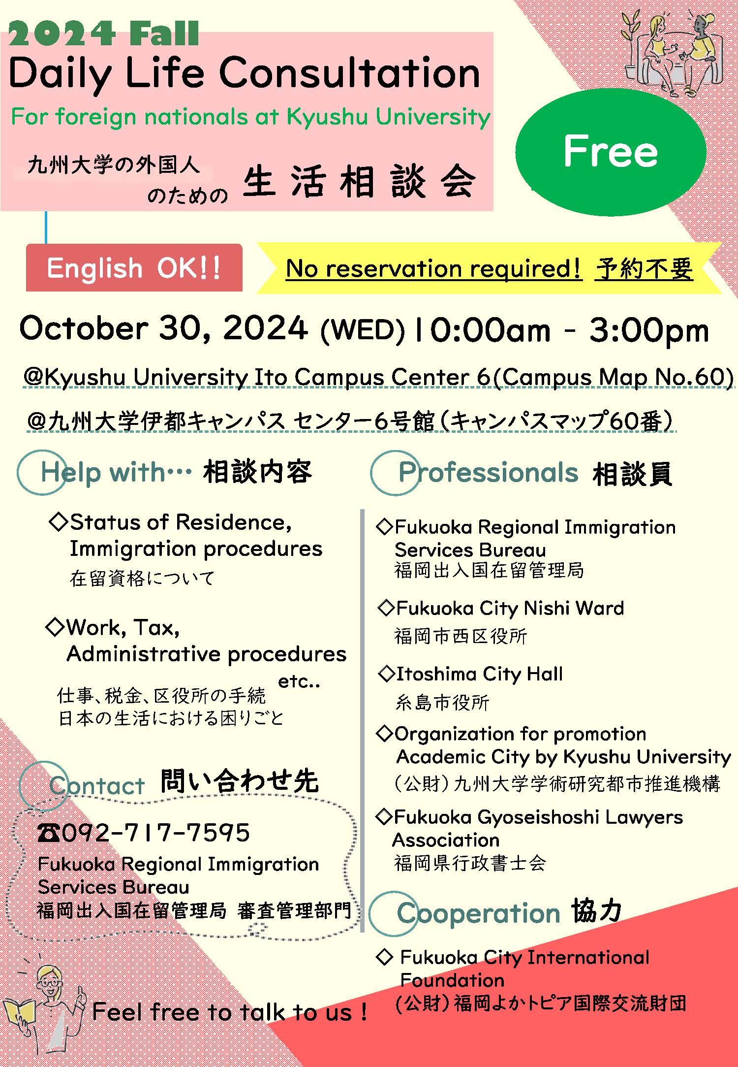 福岡出入国在留管理局が、伊都キャンパスで「生活相談会」を開催することになりましたので、お知らせします。