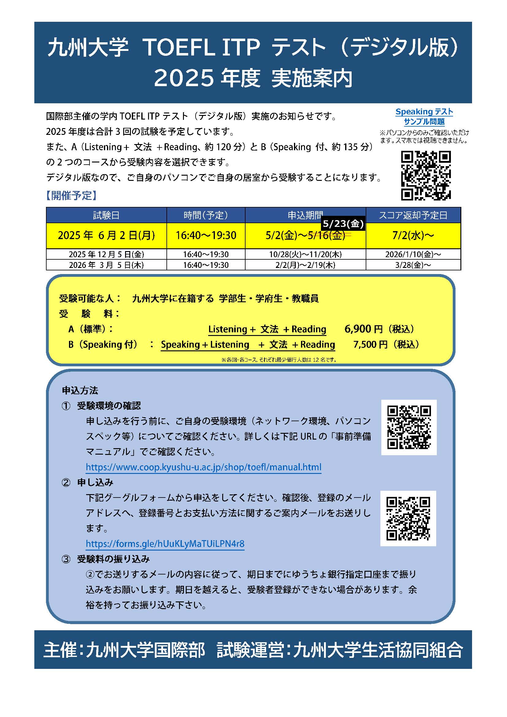 2025年度も、TOEFL ITPテスト(自宅等で受験可能なデジタル版)を6月・12月・3月の3回実施予定で九大生協にて申込できます!