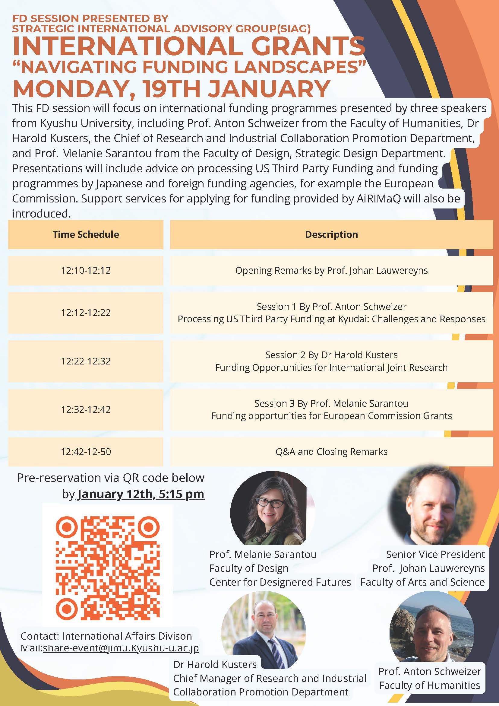 メラニー・サラントウ教授(芸術工学部ストラテジックデザイン部門)、アントン・シュヴァイツァー教授(人文科学府)、ヘラルド・クスタース主幹(研究・産学官連携推進部)の三人のスピーカーによるプレゼンテーションを通して、国際的な資金提供プログラムに焦点を当てたセッションとなる予定です。