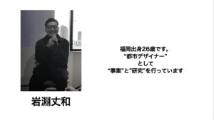 The first speaker, Mr. Iwabuchi, is currently conducting research in the doctoral course of the Graduate School of Human Environment Studies, and at the same time he is active in a wide range of businesses related to urban development. While developing his expertise through research at the graduate school, he feeds this expertise back into his daily work. As more and more diverse work styles are expected to emerge in the future, this talk was very informative for students who are about to enter the workforce.